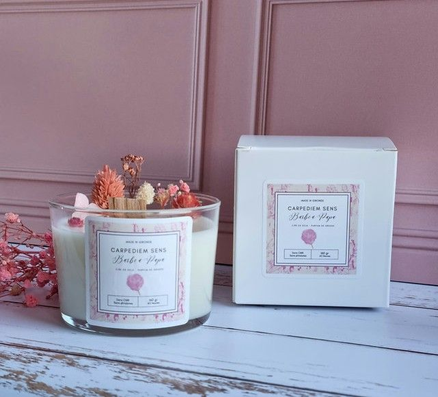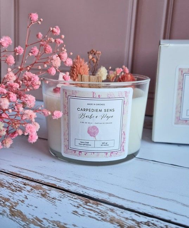 Cette bougie végétale artisanale senteur Barbe à Papa parfumera votre intérieur pour une de durée de 35 h env. pour le format 160 Gr et de 60 h env. pour celle de 260 Gr. Réponds aux normes IFRA51/ CLP CE