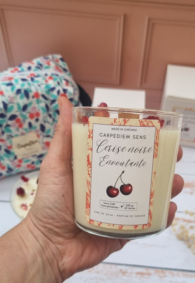Succombez pour l'envoûtante Cerise noire de cette bougie végétale artisanale coulée à la main dans notre atelier situé en Gironde. Un parfum riche et dynamique qui englobe la profondeur de la cerise noire, la douceur de l'amande et de frangipane et s'ouvre sur un coeur juteux de cerise soutenu par une base vanillée.. de quoi fondre de gourmandise !