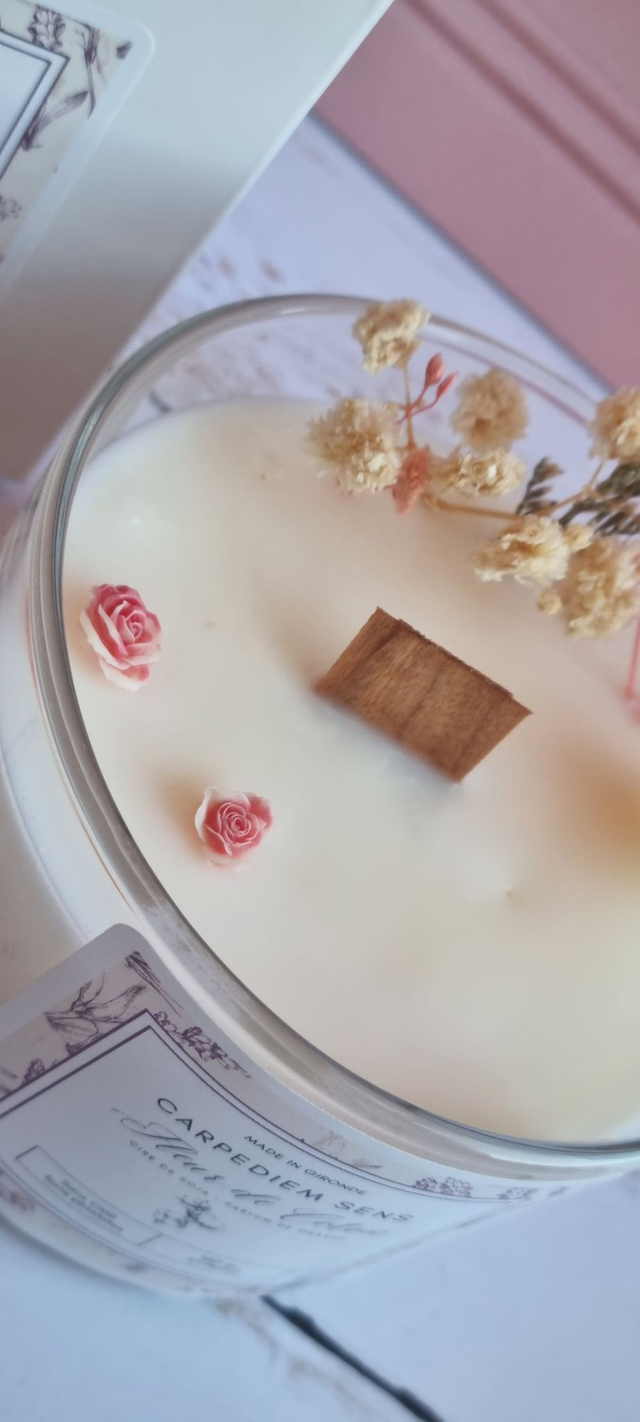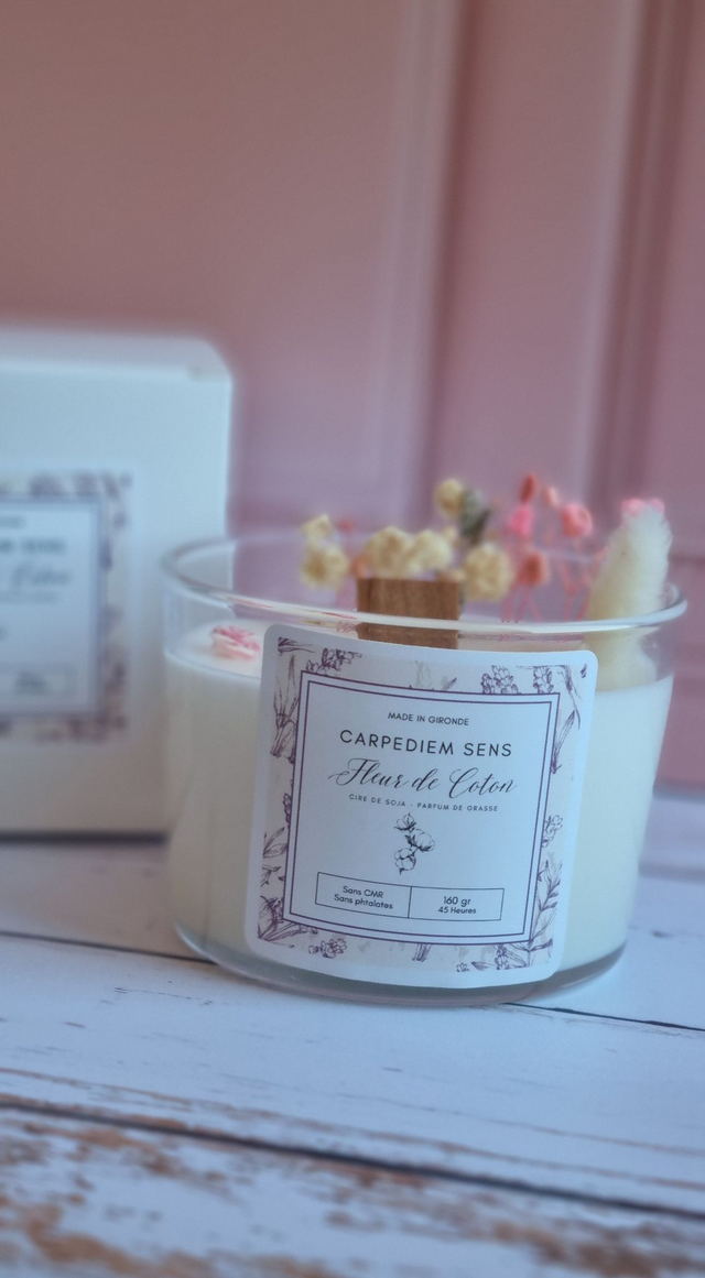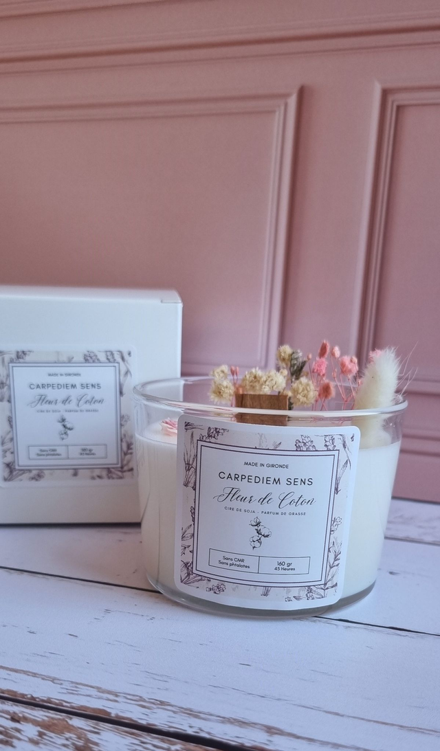 Bougie végétale artisanale parfumée Fleur de Coton coulée à la main dans notre atelier situé en Gironde.